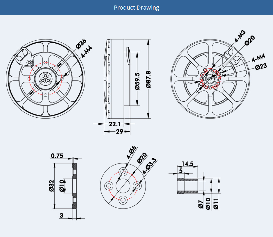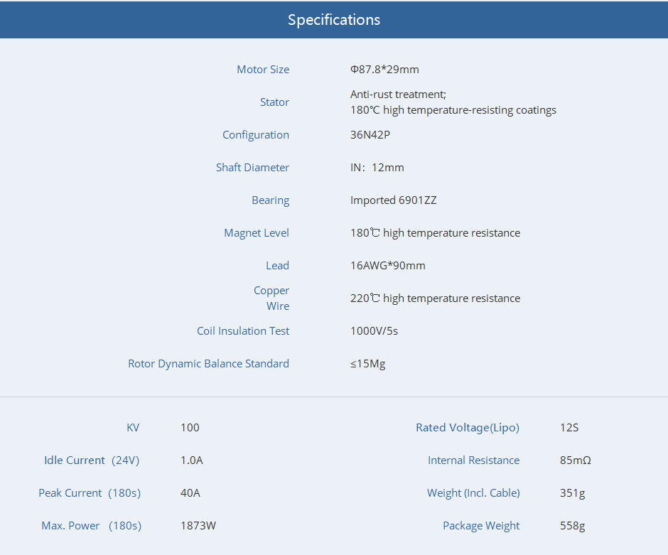 • Max.Thrust:11.8kg, Motor Weight:351g, Power Ratio:34