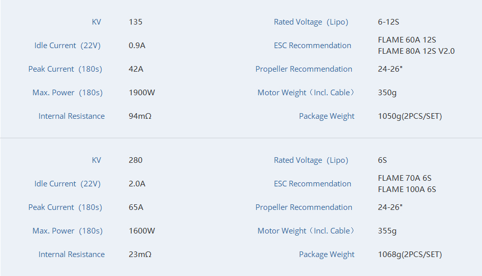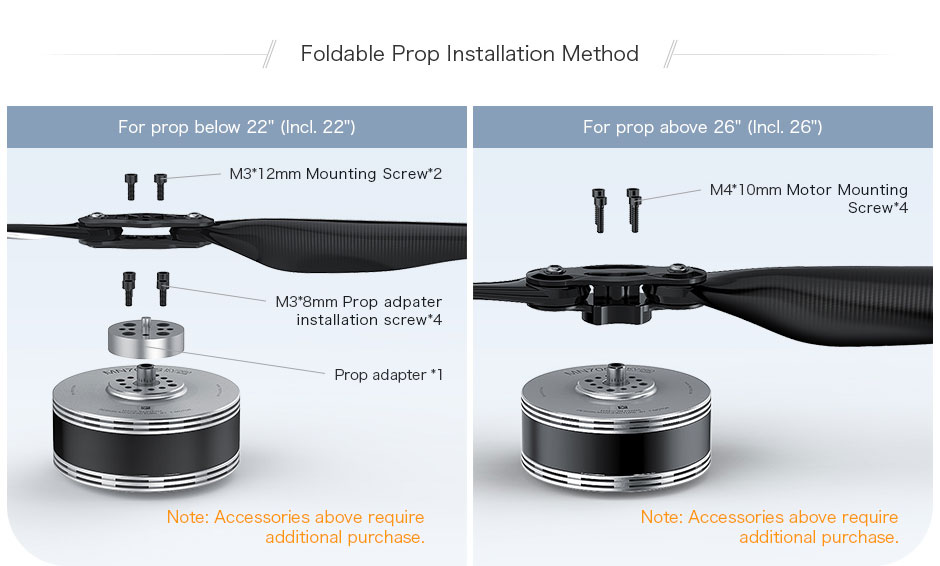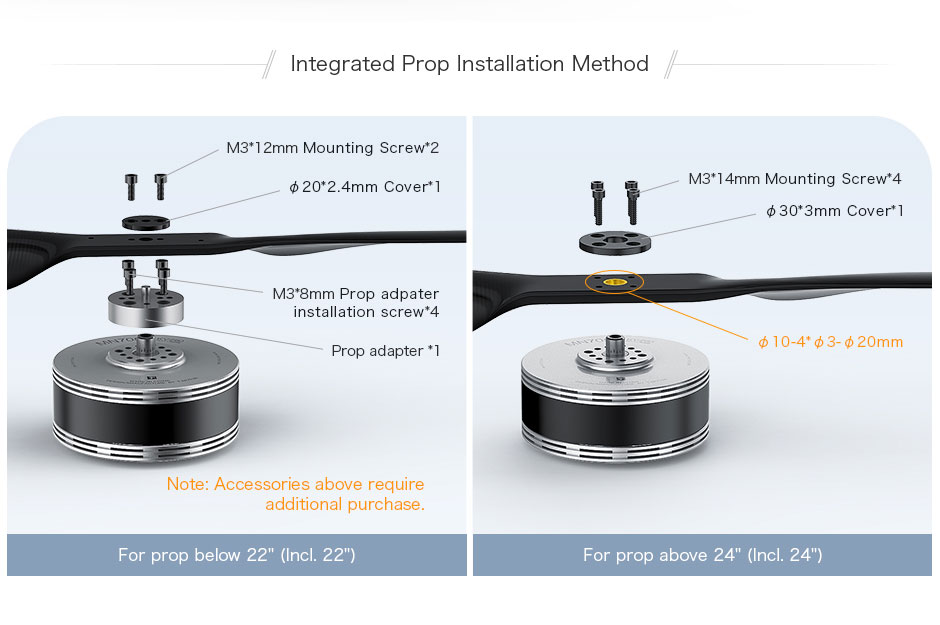 • Flight time 5% longer • Max. Thrust 7.3kg • Motor service life-- 1500 flights (40mins/flight) • ATA01123 prop adapter for P22inch prop