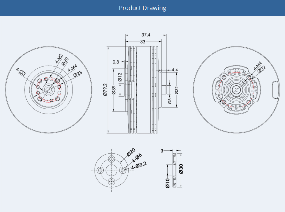 • Flight time 5% longer • Max. Thrust 7.3kg • Motor protection IP55 • Motor service life-- 1500 flights (40mins/flight) • ATA01123 prop adapter for P22inch prop